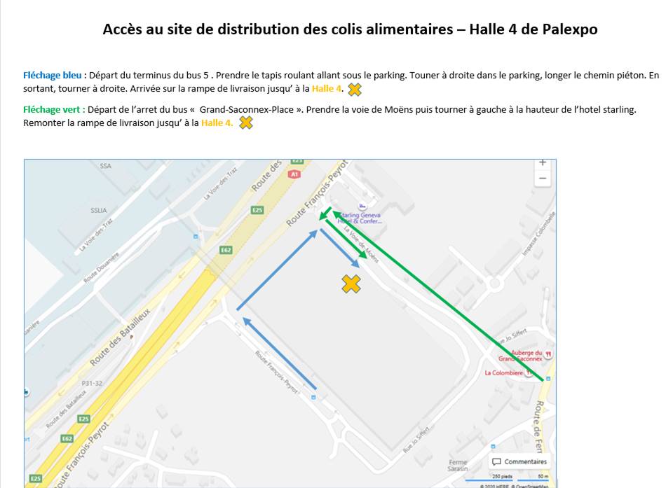 Une distribution alimentaire est co-pilotée par les communes du Grand–Saconnex et de Versoix, elle couvre le secteur des 7 communes de la rive droite du lac (Genthod, Bellevue, Prégny – Chambésy, Collex-Bossy et Céligny).